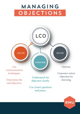 MANAGING OBJECTIONS LCO LISTEN OFFER CONFIRM Use Options. communication techniques. Customer solves Understand the objection by Determine the objection clearly. choosing. real objection. Use closed questions and pause.