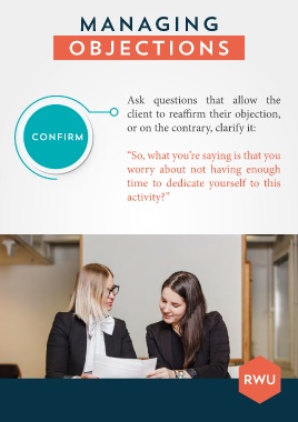 MANAGING OBJECTIONS Ask questions that allow the client to rea rm their objection, or on the contrary, clarify it: CONFIRM “So, what you’re saying is that you worry about not having enough time to dedicate yourself to this activity?”