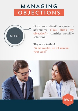 MANAGING OBJECTIONS Once your client’s response is a rmative (“Yes, that’s my objection”), consider possible OFFER solutions. e key is to think: “What would I do if I were in your case?”