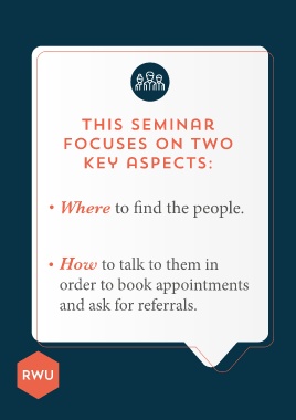 This seminar focuses on two key aspects: Where to nd the people. How to talk to them in order to book appointments and ask for referrals.