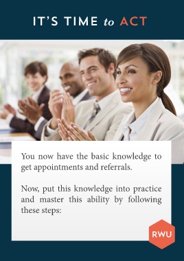 IT’S TIME to ACT You now have the basic knowledge to get appointments and referrals. Now, put this knowledge into practice and master this ability by following these steps: