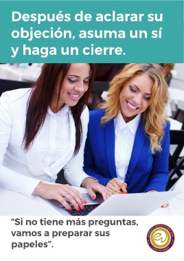 Después de aclarar su objeción, asuma un sí y haga un cierre. “Si no tiene más preguntas, vamos a preparar sus papeles”.