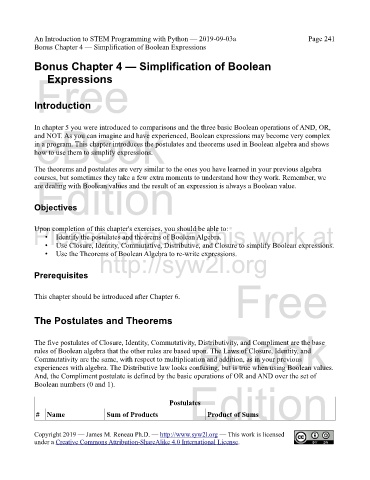 in a program. This chapter introduces the postulates and theorems used in Boolean algebra and shows