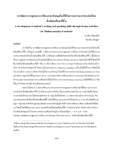 ผลการวิจัยพบว่า 1) ผลการศกษาความสามารถทางการพูดและการเขยนโดยใช้กิจกรรมการละคร