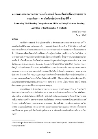 ภาษาไทยโดยใช้กิจกรรมการอ่านแบบกว้างขวาง สถตทใช้ในการวิจัย ได้แก่ ค่ารอยละ ค่าเฉลย ค่าส่วน
