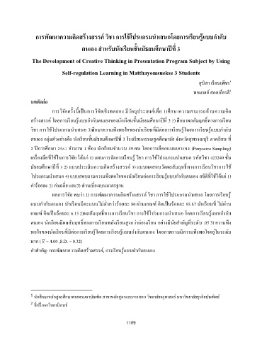 ผลการวิจัย พบว่า 1) การพัฒนาความคดสรางสรรค์ วิชา การใช้โปรแกรมน าเสนอ โดยการเรยนร ู ้
