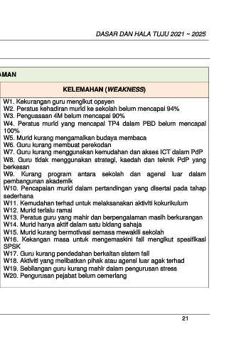 S6. Dasar penilaian kokurikulum (PAJSK) terkini dan mudah difahami W9. Kurang program antara sekolah dan agensi luar dalam