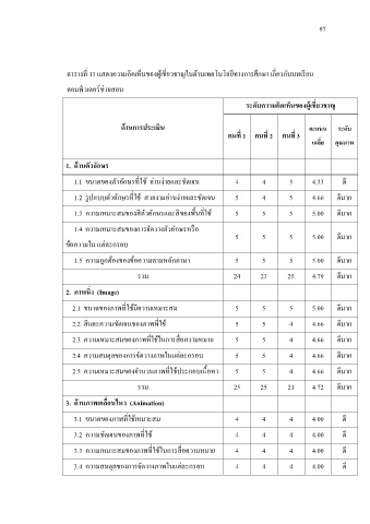 ตารางท 13 แสดงความคดเหนของผู้เชยวชาญในด้านเทคโนโลยีทางการศกษา เกียวกับบทเรยน