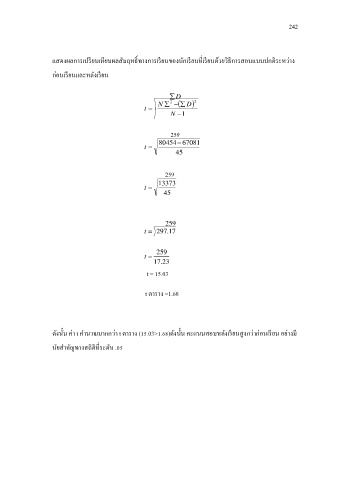 ดังนั้น ค่า t ค านวณมากกว่า t ตาราง (15.03>1.68)ดังนั้น คะแนนสอบหลังเรยนสงกว่าก่อนเรยน อย่างม ี