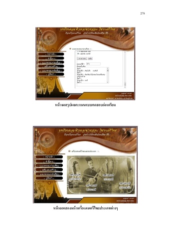 278 ้ ่ หนาจอสรุปผลคะแนนแบบทดสอบกอนเรยน ี ่ หนาจอแสดงหนาเครองดนตรไทยประเภทตางๆ ้ ื่ ี ้