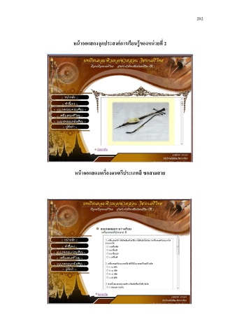 282 ี ์ ้ ่ ่ ้ หนาจอแสดงจุดประสงคการเรยนรูของหนวยที 2 ี หนาจอแสดงเครองดนตรประเภทส ซอสามสาย ื่ ี ้