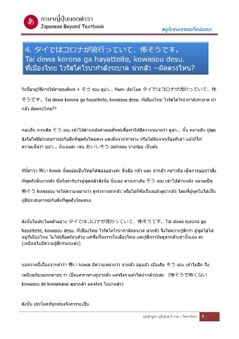 そうです。Tai dewa korona ga hayatteite, kowasou desu. ที่เมืองไทย ไวรัสโคโรนากําลังระบาด นา