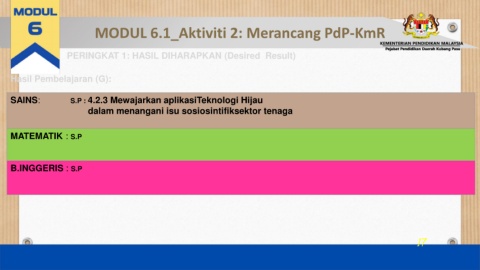 MODUL 6.1_Aktiviti 2: Merancang PdP-KmR PERINGKAT 1: HASIL DIHARAPKAN (Desired Result) Hasil Pembelajaran (G): SAINS: S.P : 4.2.3 Mewajarkan aplikasiTeknologi Hijau dalam menangani isu sosiosintifiksektor tenaga MATEMATIK : S.P B.INGGERIS : S.P 17