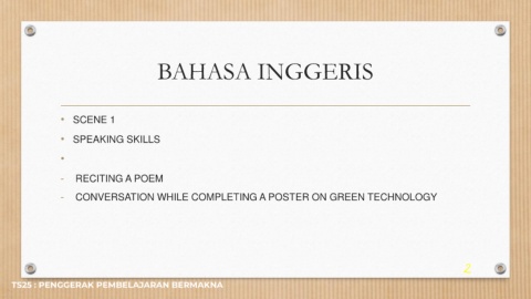BAHASA INGGERIS • SCENE 1 • SPEAKING SKILLS • - RECITING A POEM - CONVERSATION WHILE COMPLETING A POSTER ON GREEN TECHNOLOGY 2 TS25 : PENGGERAK PEMBELAJARAN BERMAKNA