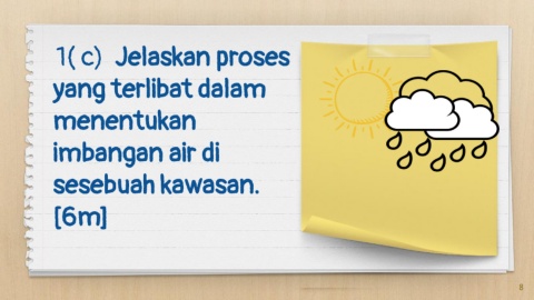 1( c) Jelaskan proses yang terlibat dalam menentukan imbangan air di sesebuah kawasan. [6m] 8