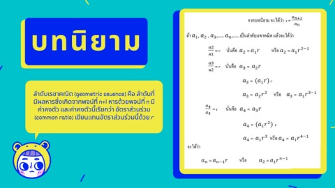 ิ บทนยาม ั ํ ื ั ลาดบเรขาคณิต (geometric seuence) คอ ลาดบท ี ํ ี ้ ์ มีผลหารซึงเกดจากพจนท n+1 หารดวยพจนท n มี ์ ี ิ ั ่ ั ่ ี คาคงตว และคาคงตวนเรียกว่า อตราส่วนร่วม ั ้ ั ี (common ratio) เขียนแทนอตราส่วนร่วมนดวย r