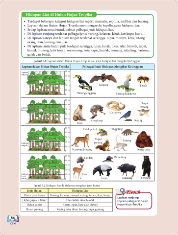Jadual 5.1: Lapisan dalam Hutan Hujan Tropika dan jenis hidupan liar mengikut ketinggian