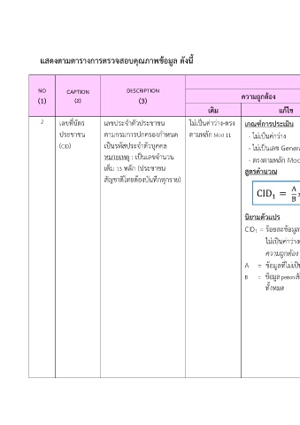 2 เลขที่บัตร เลขประจำตัวประชาชน ไมเปนคาวาง-ตรง เกณฑการประเมิน ตรงตามหลัก Mod 11 เกณฑการประเมิน จำนวนขอมูล สวนกลาง