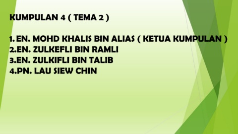 KUMPULAN 4 ( TEMA 2 ) 1.EN. MOHD KHALIS BIN ALIAS ( KETUA KUMPULAN ) 2.EN. ZULKEFLI BIN RAMLI 3.EN. ZULKIFLI BIN TALIB 4.PN. LAU SIEW CHIN