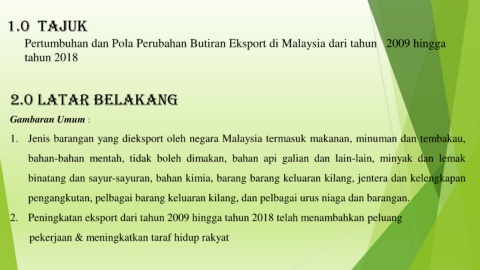 1. Jenis barangan yang dieksport oleh negara Malaysia termasuk makanan, minuman dan tembakau,