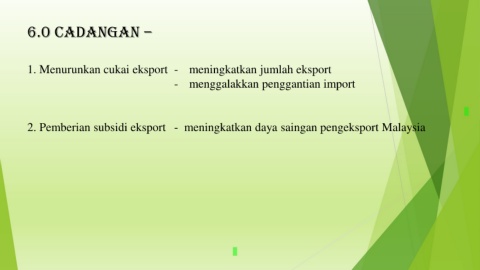 6.0 CaDangan – 1. Menurunkan cukai eksport - meningkatkan jumlah eksport - menggalakkan penggantian import 2. Pemberian subsidi eksport - meningkatkan daya saingan pengeksport Malaysia