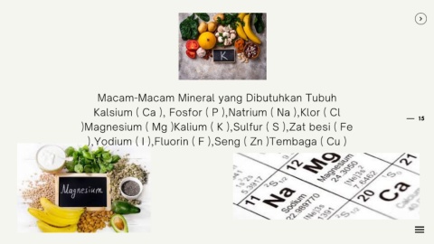 Macam-Macam Mineral yang Dibutuhkan Tubuh Kalsium ( Ca ), Fosfor ( P ),Natrium ( Na ),Klor ( Cl 1 5 )Magnesium ( Mg )Kalium ( K ),Sulfur ( S ),Zat besi ( Fe ),Yodium ( I ),Fluorin ( F ),Seng ( Zn )Tembaga ( Cu )
