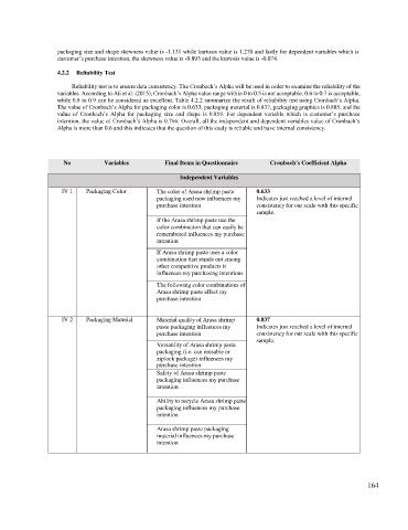 value of Cronbach’s Alpha for packaging size and shape is 0.859. For dependent variable which is customer’s purchase