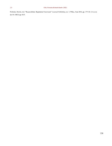 228 Geby Firstania Rolanda Rambe (2022) Nicholas, David, et al. “ResearchGate: Reputation Uncovered.” Learned Publishing, no. 3, Wiley, June 2016, pp. 173–82. Crossref, doi:10.1002/leap.1035. 228