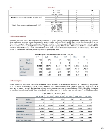 attitudes (EBA) which is only 3.2524. For standard deviation, 0.74817 shows the highest dispersion on Visit Intention (VI). On the other