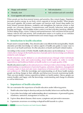 of wastes, need of clean and safe water, importance of balanced diet, control of diseases