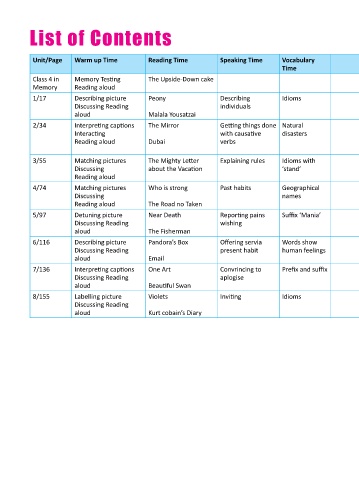 Unit/Page Warm up Time Reading Time Speaking Time Vocabulary Grammar Time Listening Time Pronunciation Fun Time Writing Time