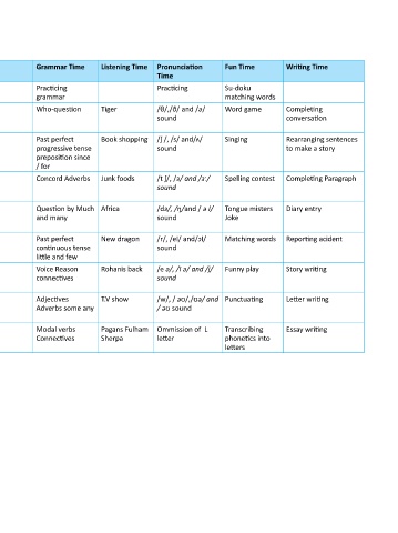 Unit/Page Warm up Time Reading Time Speaking Time Vocabulary Grammar Time Listening Time Pronunciation Fun Time Writing Time