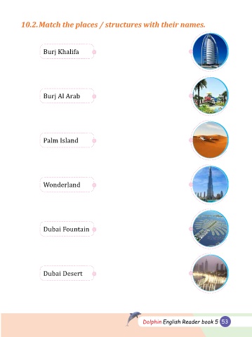 10.2. Match the places / structures with their names. Burj Khalifa Burj Al Arab Palm Island Wonderland Dubai Fountain Dubai Desert Dolphin English Reader book 5 53