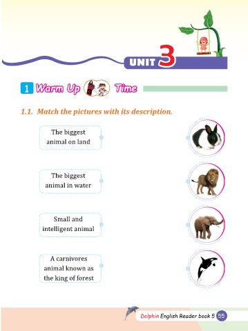Unit 3 1 Warm Up Time 1.1. Match the pictures with its description. The biggest animal on land The biggest animal in water Small and intelligent animal A carnivores animal known as the king of forest Dolphin English Reader book 5 55
