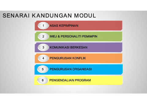 SENARAI KANDUNGAN MODUL • 1 ASAS KEPIMPINAN • 2 IMEJ & PERSONALITI PEMIMPIN • 3 KOMUNIKASI BERKESAN • 4 PENGURUSAN KONFLIK • 5 PENGURUSAN ORGANISASI • 6 PENGENDALIAN PROGRAM