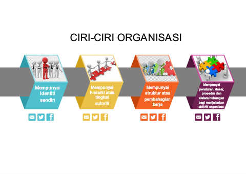 CIRI-CIRI ORGANISASI Mempunyai Mempunyai Mempunyai Mempunyai peraturan, dasar, identiti hierarki atau struktur atau prosedur dan tingkat sistem hubungan sendiri pembahagian autoriti kerja bagi menjalankan aktiviti organisasi