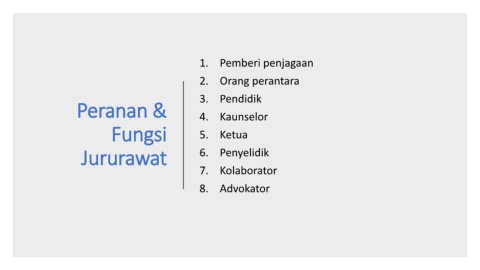 1. Pemberi penjagaan 2. Orang perantara 3. Pendidik Peranan & 4. Kaunselor Fungsi 5. Ketua Jururawat 6. Penyelidik 7. Kolaborator 8. Advokator