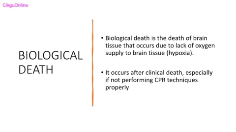 CikguOnline CikguOnline • Biological death is the death of brain tissue that occurs due to lack of oxygen BIOLOGICAL supply to brain tissue (hypoxia). DEATH • It occurs after clinical death, especially if not performing CPR techniques properly