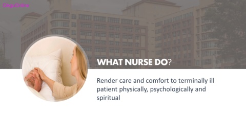 CikguOnline CikguOnline WHAT NURSE DO? Render care and comfort to terminally ill patient physically, psychologically and spiritual
