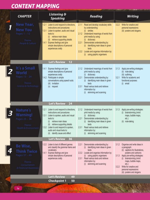 Pages 37 – 49 1.4.1 Express feelings and give 2.2.2 Locate and organise information by: 3.1.3 Apply pre-writing strategies: (iii) countable nouns discriminate 5.1.3 Share personal responses of issues • Global Sustainability