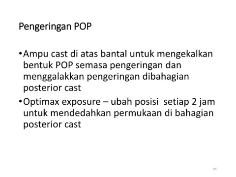 Pengeringan POP •Ampu cast di atas bantal untuk mengekalkan bentuk POP semasa pengeringan dan menggalakkan pengeringan dibahagian posterior cast •Optimax exposure – ubah posisi setiap 2 jam untuk mendedahkan permukaan di bahagian posterior cast 102