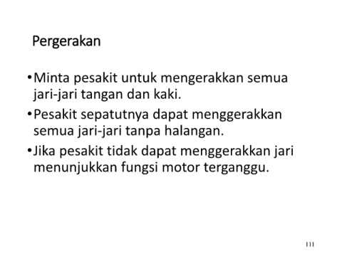 Pergerakan •Minta pesakit untuk mengerakkan semua jari-jari tangan dan kaki. •Pesakit sepatutnya dapat menggerakkan semua jari-jari tanpa halangan. •Jika pesakit tidak dapat menggerakkan jari menunjukkan fungsi motor terganggu. 111