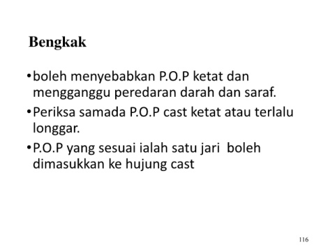 Bengkak •boleh menyebabkan P.O.P ketat dan mengganggu peredaran darah dan saraf. •Periksa samada P.O.P cast ketat atau terlalu longgar. •P.O.P yang sesuai ialah satu jari boleh dimasukkan ke hujung cast 116