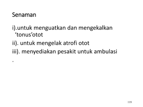 Senaman i).untuk menguatkan dan mengekalkan ‘tonus’otot ii). untuk mengelak atrofi otot iii). menyediakan pesakit untuk ambulasi . 119
