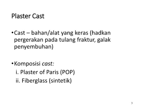 Plaster Cast •Cast – bahan/alat yang keras (hadkan pergerakan pada tulang fraktur, galak penyembuhan) •Komposisi cast: i. Plaster of Paris (POP) ii. Fiberglass (sintetik) 3