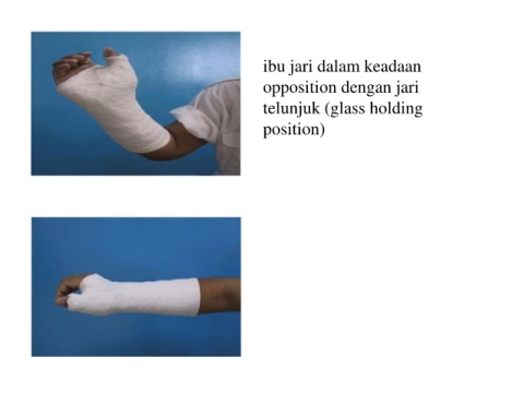 ibu jari dalam keadaan opposition dengan jari telunjuk (glass holding position)
