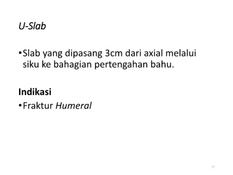U-Slab •Slab yang dipasang 3cm dari axial melalui siku ke bahagian pertengahan bahu. Indikasi •Fraktur Humeral 37