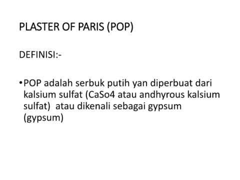 PLASTER OF PARIS (POP) DEFINISI:- •POP adalah serbuk putih yan diperbuat dari kalsium sulfat (CaSo4 atau andhyrous kalsium sulfat) atau dikenali sebagai gypsum (gypsum)