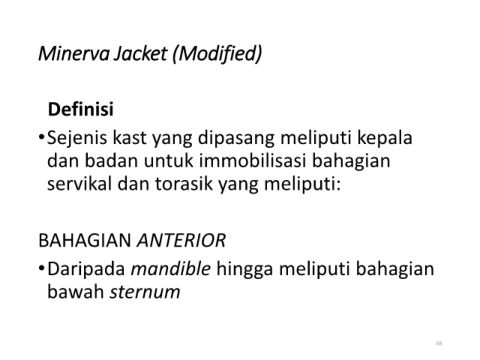 Minerva Jacket (Modified) Definisi •Sejenis kast yang dipasang meliputi kepala dan badan untuk immobilisasi bahagian servikal dan torasik yang meliputi: BAHAGIAN ANTERIOR •Daripada mandible hingga meliputi bahagian bawah sternum 48