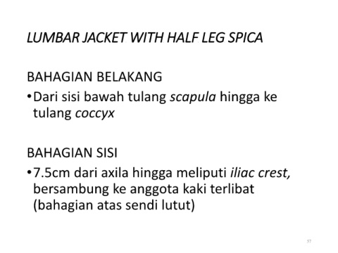 LUMBAR JACKET WITH HALF LEG SPICA BAHAGIAN BELAKANG •Dari sisi bawah tulang scapula hingga ke tulang coccyx BAHAGIAN SISI •7.5cm dari axila hingga meliputi iliac crest, bersambung ke anggota kaki terlibat (bahagian atas sendi lutut) 57